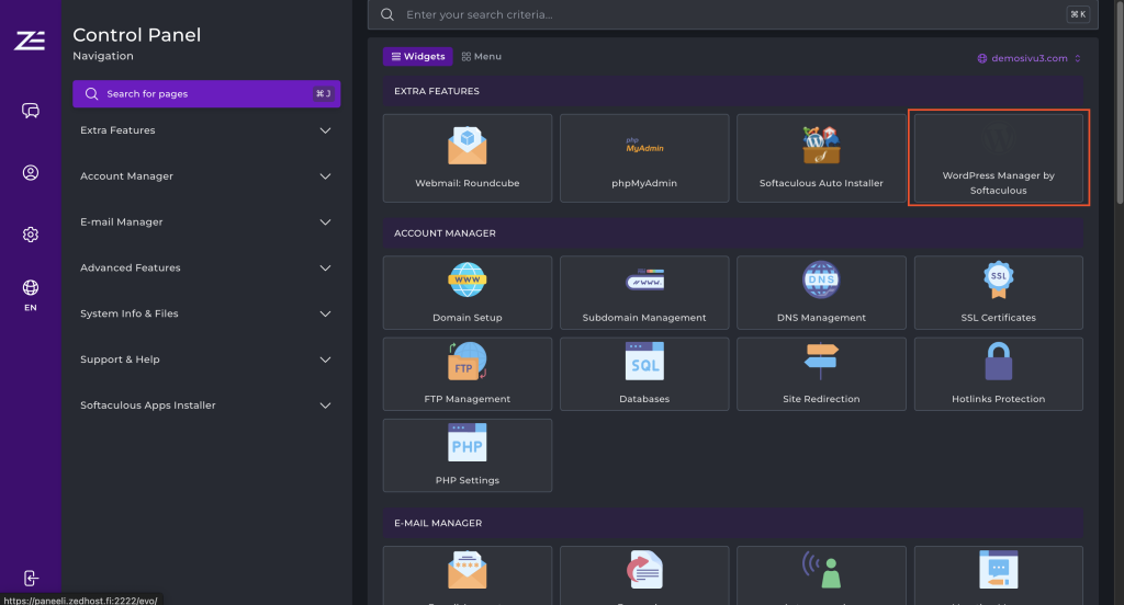 Valitse “WordPress Manager by Softaculous” oikeasta yläkulmasta kohdasta Extra Features.