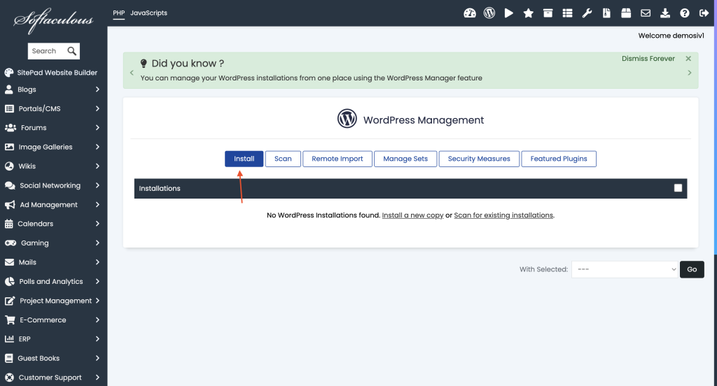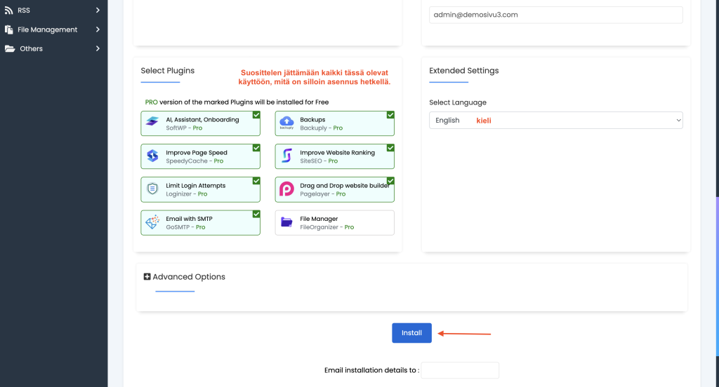 Softaculousin hallintasivulla näet “Install”-painikkeen.