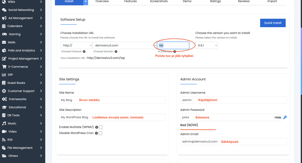 Poista “wp” kohtaan “In Directory” – näin WordPress asennetaan suoraan päädomainiin (esim. omadomain.com).
