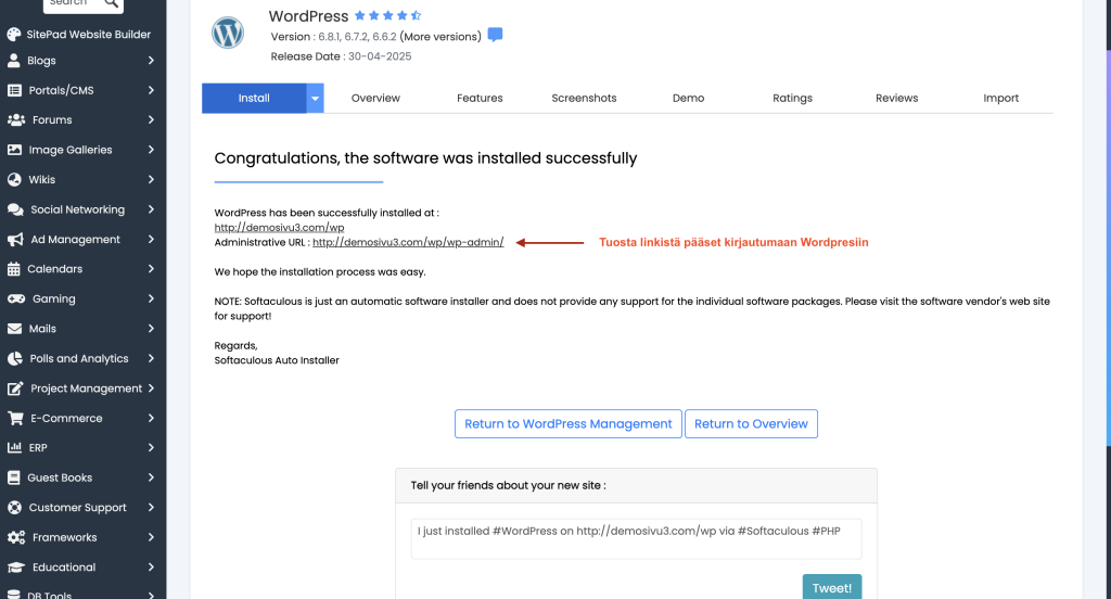 ➡️ Tämä vie sinut suoraan hallintasivulle, josta voit asentaa WordPressin.