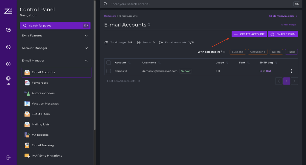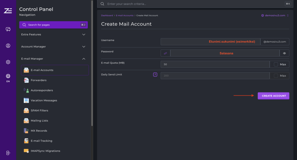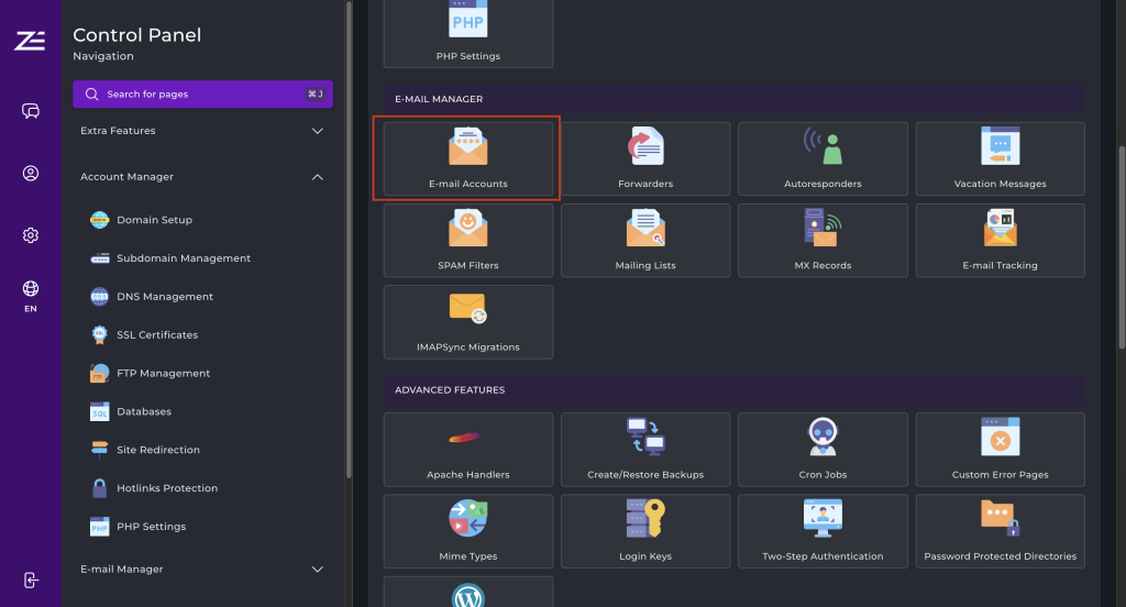 Valitse vasemmasta sivuvalikosta E-mail Manager ja napsauta kohtaa E-mail Accounts.