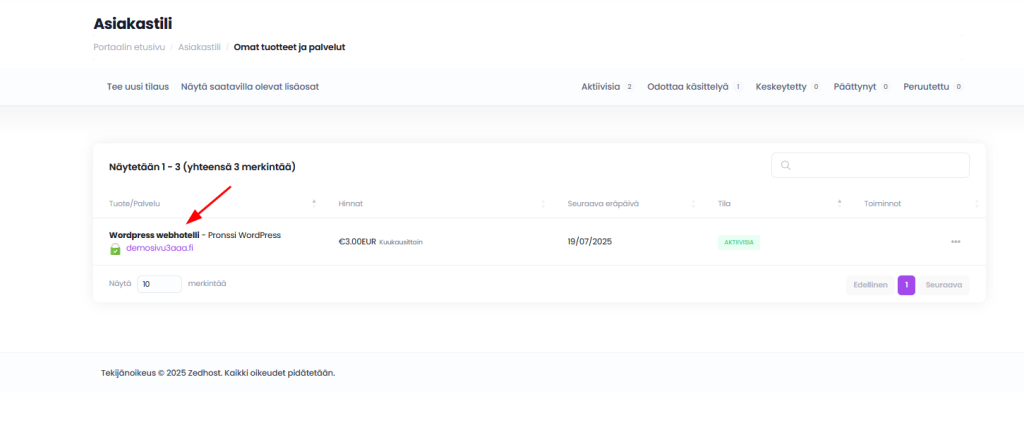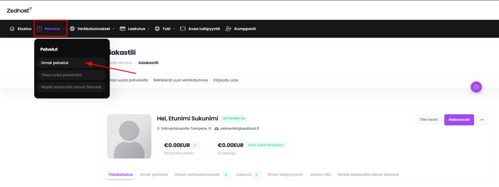 Palvelun peruakseksi täytyy sinun navigoida ylätunnuksen kautta Palvelut -> Omat palvelut osioon.