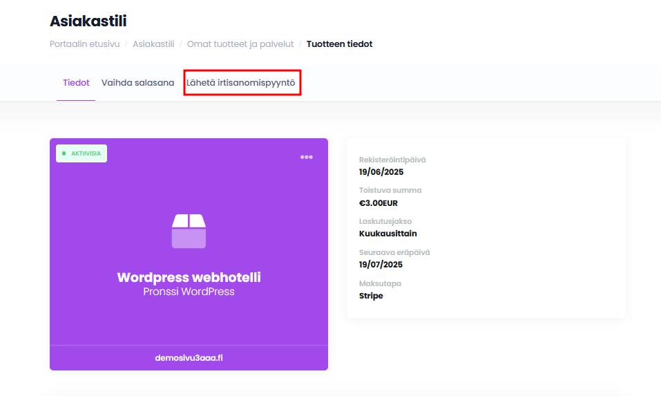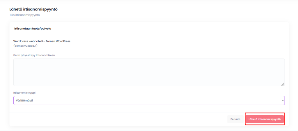 Peruutussivulla täytyy sinun kertoa syy perumiselle, sekä valita haluatko tuotteen perutuvan heti, vai vasta laskutuskauden lopussa. Kun olet valmis, täytyy sinun painaa vain ”Lähetä irtisanomispyyntö”-nappia. Käsittelemme irtisanomispyynnöt 48 tunnin sisällä.